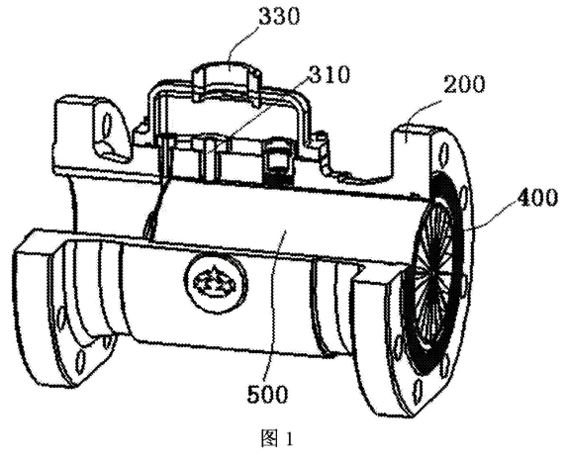在表體300的體壁上和磁屏蔽套500的套壁上開設(shè)有對應(yīng)的傳感器穿過孔310、510,將傳感器200穿過表體300的體壁上和磁屏蔽套500的套壁上的傳感器穿過孔310、510,隨后將智能積算儀100通過安裝孔330安裝在表體300上,使傳感器310的內(nèi)端與盤信號900連接,而外端與智能積算儀100信號連接。