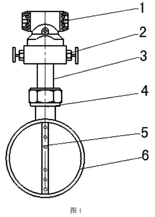 本實用新型包括差壓變送器1、三通閥2、取壓件3、鎖緊螺母4、傳感器5、管道6,管道6的上部設(shè)有開口,傳感器5的一端垂直插入管道6的內(nèi)部,傳感器5的另一端連接取壓件3,所述的取壓件3通過鎖緊螺母4固定在管道6的上部開口處,取壓件3連接三通閥2,三通閥2的端部連接差壓變送器1,所述的傳感器5包括本體5.1,本體5.1呈錐形結(jié)構(gòu),本體5.1的前端部為圓弧形錐頭5.2,本體5.1的末端部為圓弧形錐尾5.3,本體5.1的前端的圓弧形錐頭5.2為迎流方向端,所述的圓弧形錐頭5.2上設(shè)有取壓孔5.5,本體5.1的兩側(cè)設(shè)有取壓孔5.5。