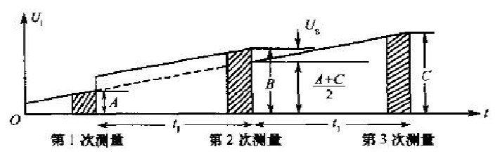 (a)方波磁場的感應強度(理想情況), (b)由電扳2個電壓Ue的測量值差得出有用電壓Uu.。 當溫度或被測介質的化學關系發(fā)生變化時,電化學干擾電壓不再保持恒定,而是以一定的時間間隅(幾秒到幾分)變化。因為純化學直流干擾電壓變化的時間遠大于測量周期的時間,所以在此間隔中這種變化可近似看做與時間呈線性關系的變化。這樣,在測量時采用簡單的線性插補方法可使電化學干擾電壓的變化和由此所引起的誤差(見圖3.8)得到抑制。為了達到此目的,在磁場關斷時測得第1個值是電化學直流干擾電壓(A值);然后接通磁場;當磁場感應強度達到*大值之后,測得的第2個值是平均變化的電化學直流干擾電壓和有用信號疊加值(B值)。當磁場再次關斷時,量測的第3個值是經間隔時同后上升的電化學直流干擾電壓(c值)。2個不同的電化學直流干擾電壓(A值和c值)的平均值與B值的疊加信號相減便獲得有用的電壓信號值Ub。