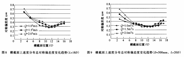 圖7以曲線的形式給出了不同橫截面速度分布總對稱偏差度的變化趨勢。從圖7可以看出,沿著直管流動方向,總對稱偏差度先減小后增大,*小值在ι=lOD(Q=1.0m3/s)和11D(Q=1.5m3/s和2.0m3/s)位置處。這是由于在靠近上游彎管和下游彎管的直管,流動受彎管的影響,且上游彎管對直管內(nèi)速度分布影響較大。ι=lOD位置的速度總對稱偏差度比ι=5D位置的降低了很多,流量Q=1.0、1.5和2.0m3/s3個(gè)工況下,速度總對稱偏差度分別減小了0.3065、0.1642/0.1907。由此可見,由于速度分布對稱度大幅度的提高,電磁流量計(jì)安裝在ι=lOD位置時(shí)流量計(jì)量的準(zhǔn)確度將大大高于電磁流量計(jì)安裝在ι=5D位置。