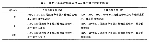 4.1.3 800mm內(nèi)徑電磁流量計(jì)測量管路設(shè)計(jì)分析 根據(jù)上述計(jì)算結(jié)果統(tǒng)計(jì)出不同過流量、不同直管長度,速度分布總對稱偏差度的*小值及對應(yīng)的位置,見表2。從表2可以看出,當(dāng)直管長度L取12m和14.4m時(shí),均有部分位置的速度分布總對稱偏差度較小,且兩種直管長度下總對稱偏差度*小值相差很小。以Q=2.0m3/s為例,L取12m和14.4m時(shí),總對稱偏差度*小值分別為0.3212和0.3198,差值為,0.0014。由此可見,當(dāng)測量直管長度達(dá)到一定值時(shí),繼續(xù)延長測量直管長度并不能顯著改善管內(nèi)速度的軸對稱分布情況。