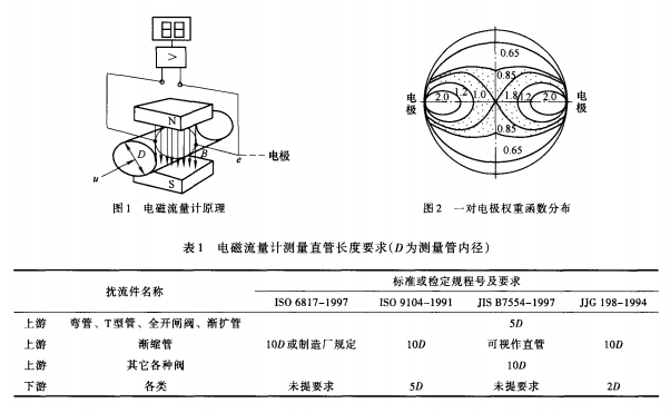 盡管電磁流量計(jì)生產(chǎn)廠家不斷追求流量計(jì)本身的精度,電磁流量計(jì)的設(shè)計(jì)和工藝技術(shù)在不斷提高,但實(shí)際測量中,工藝管道中的彎管、閥門等都會引起流動畸變、二次流或漩渦,水流只有經(jīng)過相當(dāng)長的直管,管內(nèi)流速才能呈中心軸對稱分布。對電磁流量計(jì)上、下游直管長度的要求是保證流速呈中心軸對稱分布,獲得儀表測量精確度的必要條件之一。各標(biāo)準(zhǔn)或檢定規(guī)程提出了電磁流量計(jì)所要求的上、下游直管長度,如表1所示,要求比通常要求高,這是為了保證達(dá)到0.5級精度儀表的要求。ISO6817—1997是電磁流量計(jì)應(yīng)用標(biāo)準(zhǔn),該標(biāo)準(zhǔn)規(guī)定,對任何類型的擾流件,電磁流量計(jì)上游至少應(yīng)有10D(測量管內(nèi)徑)長度的直管,性能變動才能保證不超過1%。ISO9104—1991是電磁流量計(jì)性能評定標(biāo)準(zhǔn),JJG198—1994是我國速度流量儀表通用檢定規(guī)程,雖然也適用于電磁流量計(jì),但較簡單,而ISO9104—1991比較詳細(xì)。