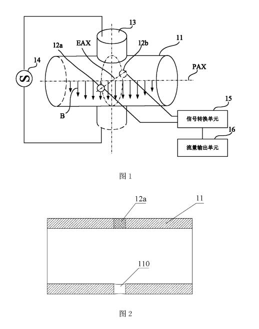 圖1顯示了現(xiàn)有技術(shù)中的一種電磁流量計(jì)的結(jié)構(gòu)。如圖1所示,所述電磁流量計(jì)包括:流動(dòng)有被測(cè)流體的測(cè)量管11,和與被測(cè)流體相接觸且對(duì)向配置在測(cè)量管11上的電極12a、12b,向被測(cè)流體施加磁場(chǎng)的勵(lì)磁線圈13,向勵(lì)磁線圈13供給勵(lì)磁電流、使其產(chǎn)生磁場(chǎng)的電源單元14。另外,所述電磁流量計(jì)還包括:與電極12a、12b連接用于檢測(cè)電極12a、l2b之間的感應(yīng)電動(dòng)勢(shì)的信號(hào)轉(zhuǎn)換單元15,從由信號(hào)轉(zhuǎn)換單元15檢測(cè)出的電極間電動(dòng)勢(shì)計(jì)算出被測(cè)流體的流量的流量輸出單元16應(yīng)用所述電磁流量計(jì),當(dāng)流體在測(cè)量管11中穿過(guò)由勵(lì)磁線圈13產(chǎn)生的磁場(chǎng)流動(dòng)時(shí),根據(jù)法拉第定律,就會(huì)在電極12a、12b上產(chǎn)生感應(yīng)電動(dòng)勢(shì),流體的平均流速與電極處感應(yīng)出的電壓之間具有線性關(guān)系,這一關(guān)系可以用下述公式表示:E=K*B*舉V,其中E為所產(chǎn)生的感應(yīng)電壓,K為比例常數(shù),B為磁場(chǎng)強(qiáng)度,D為導(dǎo)管直徑,而V為傳導(dǎo)型流體的平均流速這樣,利用信號(hào)轉(zhuǎn)換單元15和流量輸出單元16,即可測(cè)得與所述感應(yīng)電動(dòng)勢(shì)對(duì)應(yīng)的流體的流速,進(jìn)而獲得流體的流量陶瓷管電磁流量計(jì)傳感器有很多優(yōu)點(diǎn),但電極密封是一個(gè)很大難題。圖2為圖1中沿著與勵(lì)磁線圈13產(chǎn)生的磁場(chǎng)相垂直的平面用以顯示電極布置的剖示圖。如圖2,測(cè)量管11設(shè)有電極插孔110,所述電極插孔110為圓柱形或圓錐形,其厚度大致與測(cè)量管11的壁厚相當(dāng),電極(在這里僅標(biāo)示出電極12a)內(nèi)嵌于測(cè)量管11的電極插孔110中。然而,圖2所示中的電極,只有少數(shù)廠家具備特殊的燒結(jié)技術(shù),在高溫高壓環(huán)境下制作出電極以確保電極不滲漏,實(shí)現(xiàn)難度極大。而采用0型圈等機(jī)械裝配密封,由于陶瓷材料表面一定厚度會(huì)變湖,使用時(shí)間一長(zhǎng),絕緣性就會(huì)下降,影響測(cè)量精度