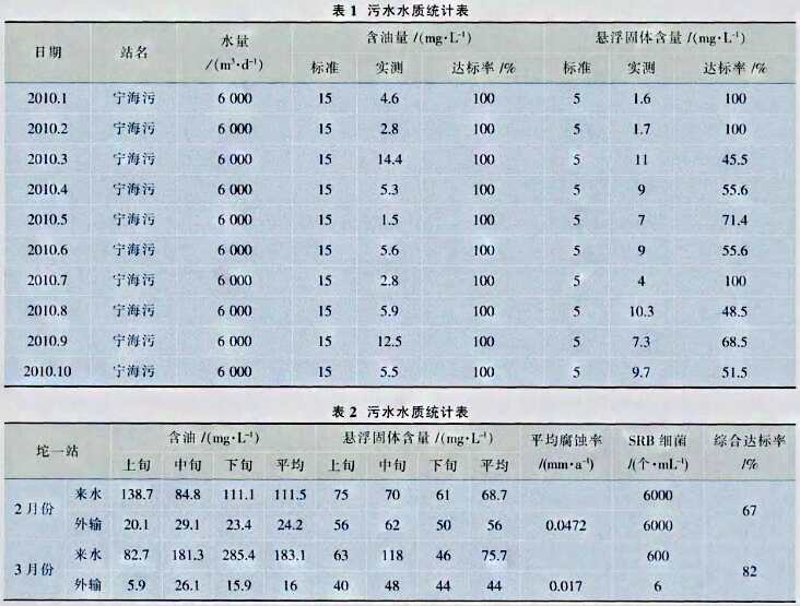 20l1年2月坨一站來水含油平均183.lmg/L外輸含油平均16mg/L,懸浮固體平均8.3mg/L,平均腐蝕率0.017mm/a,SRB細(xì)菌平均6個(gè)/ml。只有懸浮固體含量超標(biāo)。
