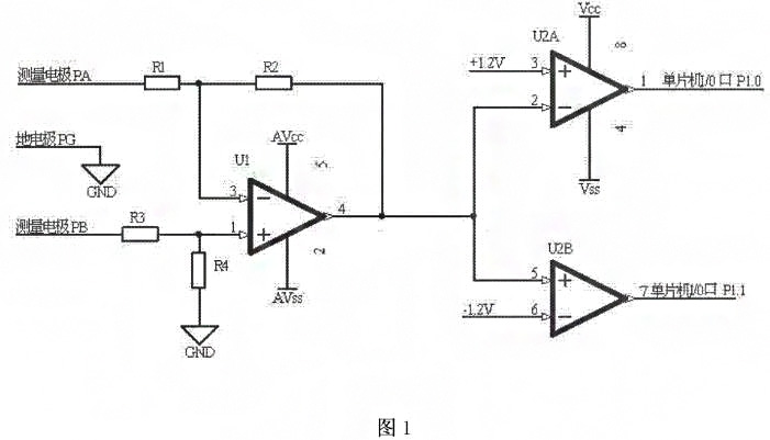 為了實現(xiàn)上述目的,所采用的技術(shù)方案是:一種應(yīng)用于電磁流量計極化電壓檢測的電路,其特征在于:測量電極PA與電阻R1的一端連接,電阻R1的另一端與電阻R2的一端、運算放大器U1的反相輸入端3腳連接,電阻R2的另一端與運算放大器U1的輸出端4腳、雙路比較器通道一U2A的反相輸入端2腳、雙路比較器通道二U2B的同相輸入端5腳連接,測量電極PB與電阻R3的一端連接,電阻R3的另一端與電阻R4的一端、運算放大器u的同相輸入端1腳連接,電阻R4的另一端與地連接,地電極PG與地連接,運算放大器u的電源供電端5腳與正電源VAcc連接,運算放大器U1的接地端2腳與負(fù)電源vAss連接,雙路比較器通道一U2A的同相輸入端3腳與+1.2V連接,雙路比較器U2A的電源供電端8腳與正電源Vcc連接,雙路比較器U2A的接地端4腳與負(fù)電源vAs連接,雙路比較器通道一U2A的輸出端1腳與單片機(jī)的Ⅰ/O口連接,雙路比較器通道二U2B的反相輸入端6腳與-1.2V連接,雙路比較器通道二U2B的輸出端7腳與單片機(jī)的I/0口連接