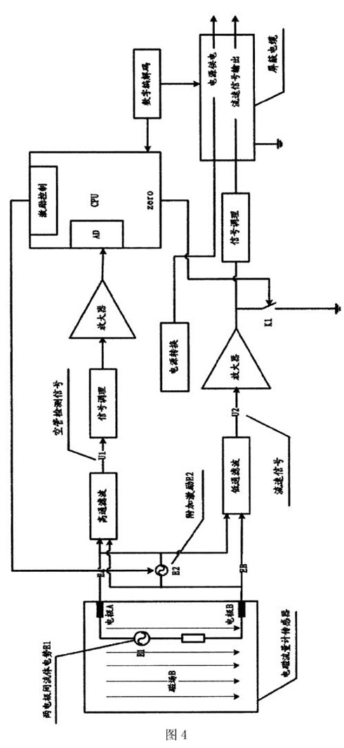 圖4是兩個(gè)電極之間施加空管檢測信號的電磁流量計(jì)的電路結(jié)構(gòu)示意圖