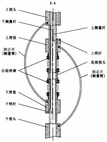 其中上、下接頭與儀器外殼相連,上、下滑套可分別在上下接頭上滑動(dòng),測(cè)量臂的兩端就分別裝在滑套和接頭上,使之受壓變形后只有一端能動(dòng)。與滑套相連的是上,下測(cè)量桿,二者通過(guò)上、下銷(xiāo)村定在一起。當(dāng)井徑變化引起測(cè)量臂壓縮時(shí), 相應(yīng)的上或下滑套隨之動(dòng)作,帶動(dòng)其上的測(cè)量桿作軸向運(yùn)動(dòng) ,井徑的變化就轉(zhuǎn)化為測(cè)量桿的位移。由檢測(cè)電路檢測(cè)這位移 ,就可得到井徑的變化。