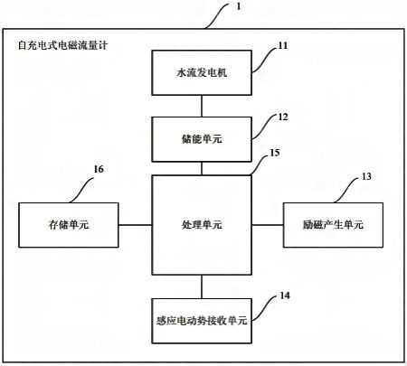 為實(shí)現(xiàn)上述目的及其他相關(guān)目的,本儀表是提供一種自充電式電磁流量計(jì),其至少包括:設(shè)置在水流經(jīng)過的管道內(nèi)的水流發(fā)電機(jī),其殼體的入水口呈喇叭狀,該殼體內(nèi)設(shè)有葉輪、齒輪增速單元、永磁直流發(fā)電機(jī);與所述水流發(fā)電機(jī)連接的儲(chǔ)能單元;用于基于控制信號(hào)來產(chǎn)生磁場(chǎng)的勵(lì)磁產(chǎn)生單元;用于基于所述勵(lì)磁產(chǎn)生單元產(chǎn)生的磁場(chǎng)來產(chǎn)生相應(yīng)感應(yīng)電動(dòng)勢(shì)的感應(yīng)電動(dòng)勢(shì)接收單元;與所述勵(lì)磁產(chǎn)生單元、感應(yīng)電動(dòng)勢(shì)接收單元及儲(chǔ)能單元連接且用于輸出所述控制信號(hào)及將所述感應(yīng)電動(dòng)勢(shì)接收單元輸入的數(shù)據(jù)進(jìn)行處理的處理單元;以及與所述處理單元連接的存儲(chǔ)單元。