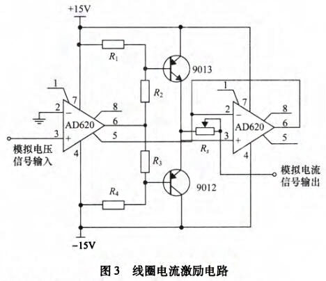 感應(yīng)電壓檢測模塊主要由勵磁電路和弧狀電極傳感器組成,其中勵磁電路用來在流體測量區(qū)域產(chǎn)生盡量均勻的磁場分布,而內(nèi)嵌在管道內(nèi)壁與流體接觸的弧狀電極傳感器則負(fù)責(zé)拾取帶有流體速度參數(shù)的感應(yīng)電壓信號。為在流體測量區(qū)域產(chǎn)生盡可能均勻的磁場,勵磁線圈采用馬鞍形線圈。在勵磁系統(tǒng)設(shè)計(jì)中,鐵芯可以提供磁通路徑,從而改變磁場分布,并加強(qiáng)磁感應(yīng)強(qiáng)度。同時,為降低鐵芯渦流損耗以及增加磁路導(dǎo)磁系數(shù),鐵芯采用表面涂有絕緣漆的薄硅鋼片疊加而成。在鐵芯上套上馬鞍形線圈即組成勵磁系統(tǒng)。直流勵磁使得弧狀電極拾取的感應(yīng)電壓中存在極化電壓信號,而交流勵磁則會引起的正交干擾和同相干擾。因此,為克服直流勵磁和交流勵磁存在的缺點(diǎn),設(shè)計(jì)采用在線圈中施加頻率∫=6.25Hz的低頻矩形波勵磁方式。勵磁電路主要包括AD620和AD71組成的壓控電流源電路和三極管9013和9012組成的互補(bǔ)對稱推挽型功率放大電路,如圖3所示,模擬電壓信號由PXI模塊的模擬信號輸出端給出。