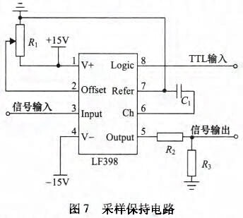 采樣保持電路實(shí)際是一種模擬信號存儲器,其開關(guān)通斷通過數(shù)字指令控制,從而完成輸入信號瞬時值的采樣及存儲。圖7所示為集成芯片LF398組成的采樣保持電路,該電路具有采樣速度快、保持下降速度慢、抗干擾能力強(qiáng)和不易受溫度影響等特點(diǎn),其邏輯電平輸人與TI相連。當(dāng)TTL為高電平時,對輸入信號進(jìn)行采樣;當(dāng)TIL為低電平時,對輸入信號進(jìn)行保持。
