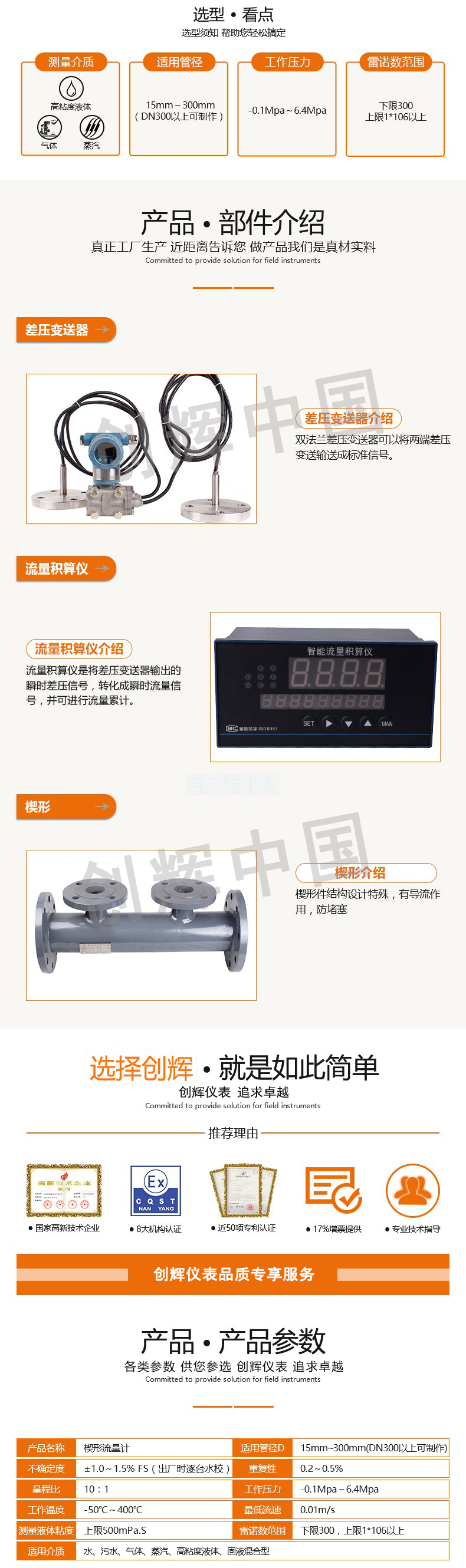 (6)分離型楔形流量計,可通過更換楔形件達到擴展量程或改變量程的目的;