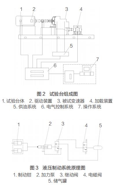 變速器超越離合器可靠性試驗臺主要由試驗臺體 1(試驗平臺、驅(qū)動電機支座、前支座、后支座)、驅(qū)動裝置 2(驅(qū)動電機、聯(lián)軸器)、被試變速器 3、加載裝置 4(液壓制動系統(tǒng))、供油系統(tǒng) 5、電氣控制系統(tǒng) 6、